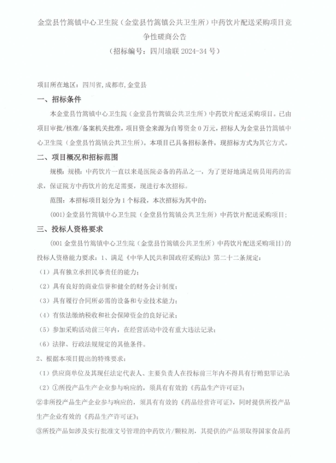 【成都市金堂县竹篙镇中心卫生院】四川省成都市金堂县竹篙镇中心卫生院(金堂县竹篙镇公共卫生所)中药饮片配送采购项目竞争性磋商公告