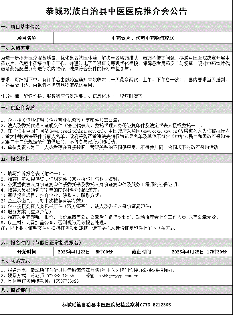 【桂林市恭城瑶族自治县中医医院】广西壮族自治区桂林市恭城瑶族自治县中医医院中药饮片、代煎中药物流配送推介会公告