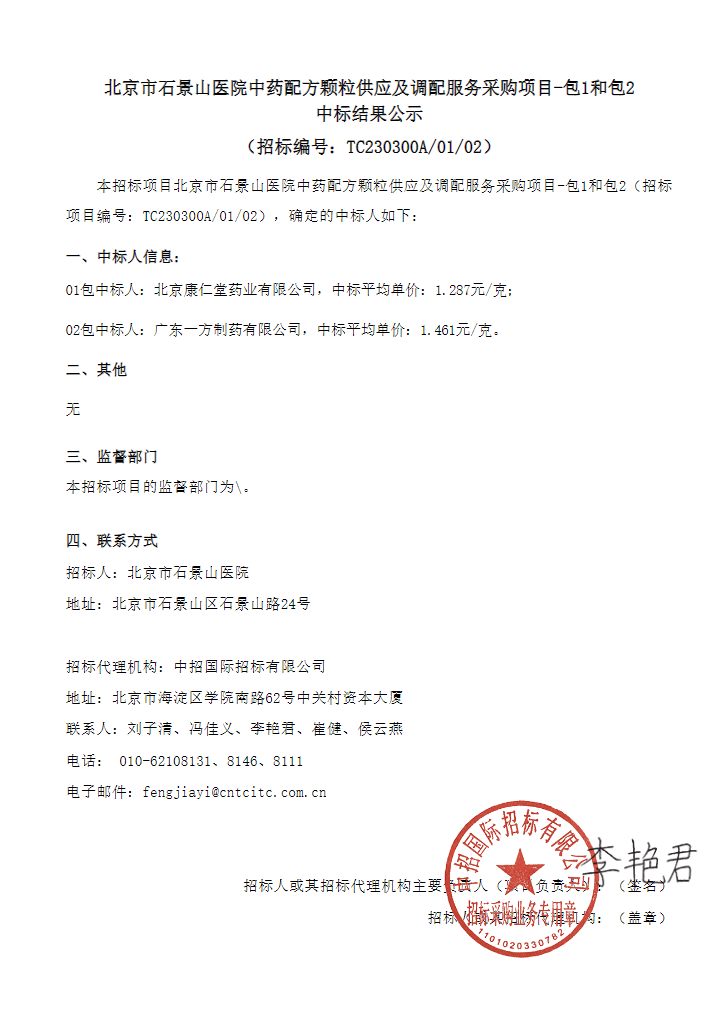 【北京市石景山医院】北京市石景山医院中药配方颗粒供应及调配服务采购项目-包1和包2-结果公告