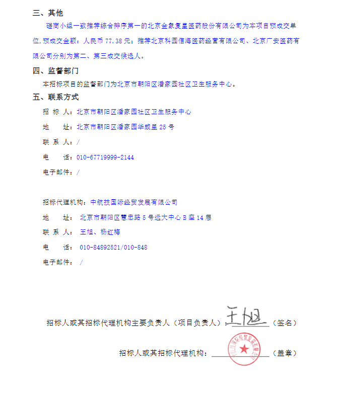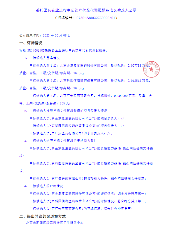 【北京市朝阳区潘家园社区卫生服务中心】北京市朝阳区潘家园社区卫生服务中心委托医药企业进行中药饮片代煎代调配服务成交候选人公示