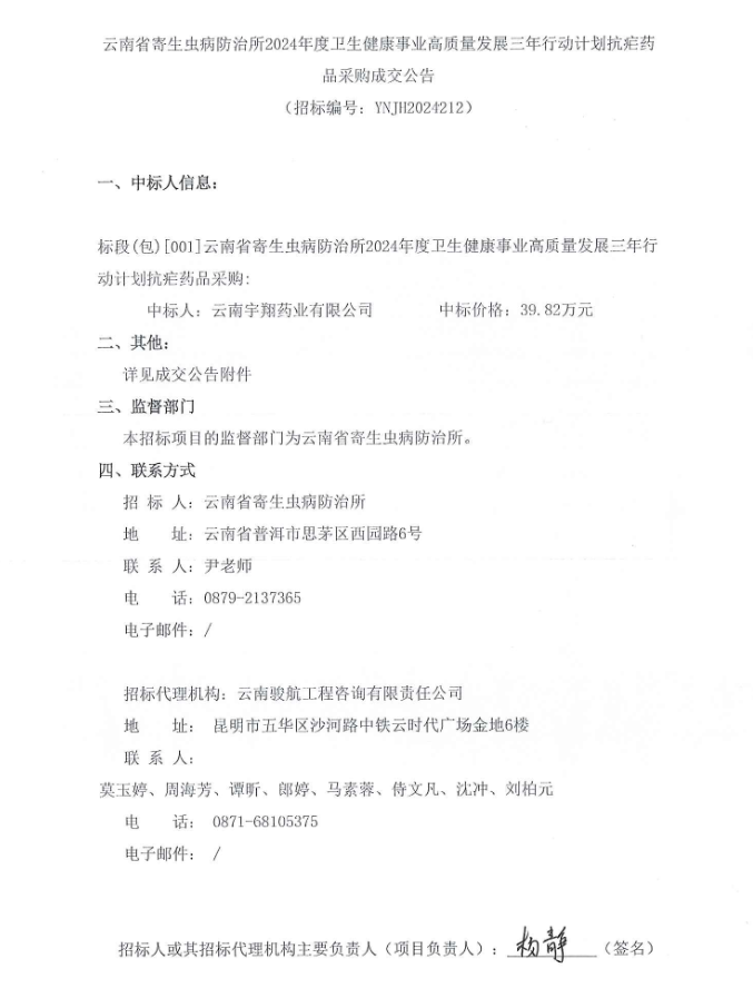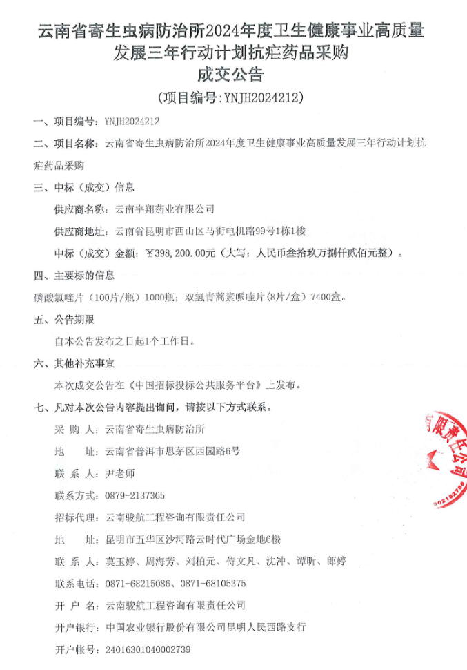 【云南省寄生虫病防治所】云南省寄生虫病防治所2024年度卫生健康事业高质量发展三年行动计划抗疟药品采购成交公告