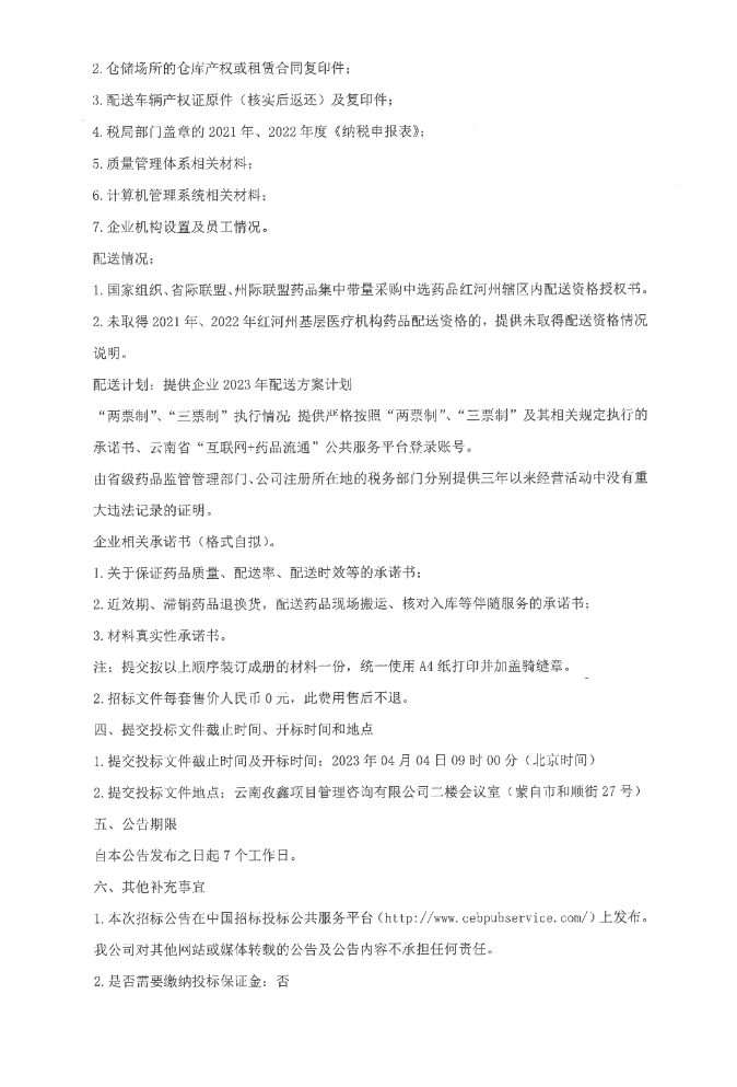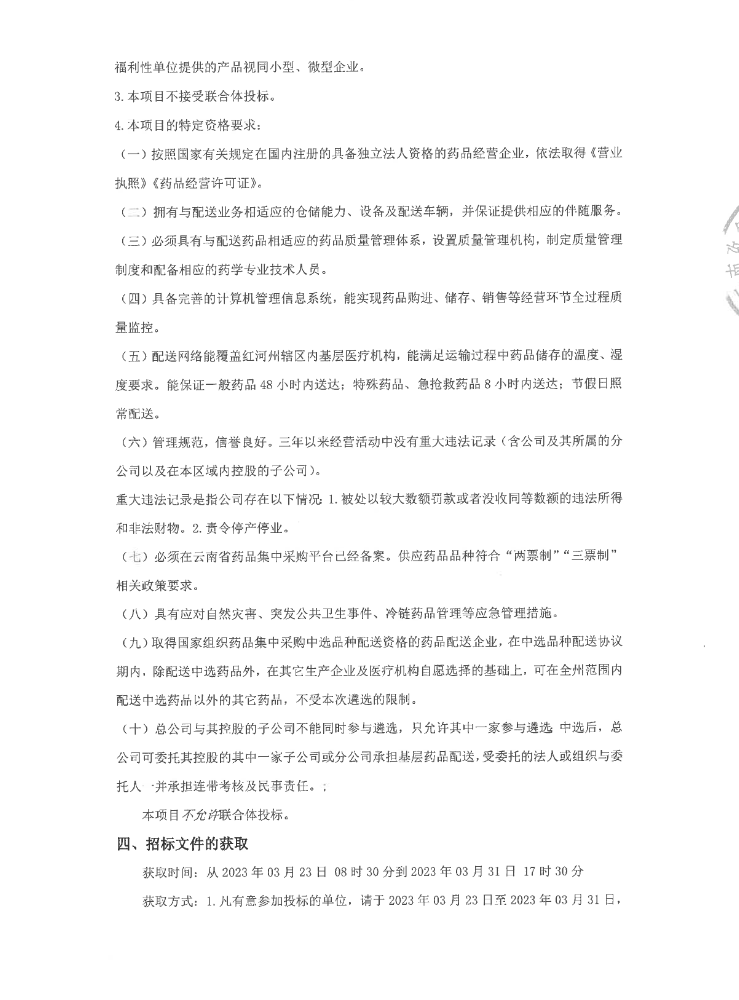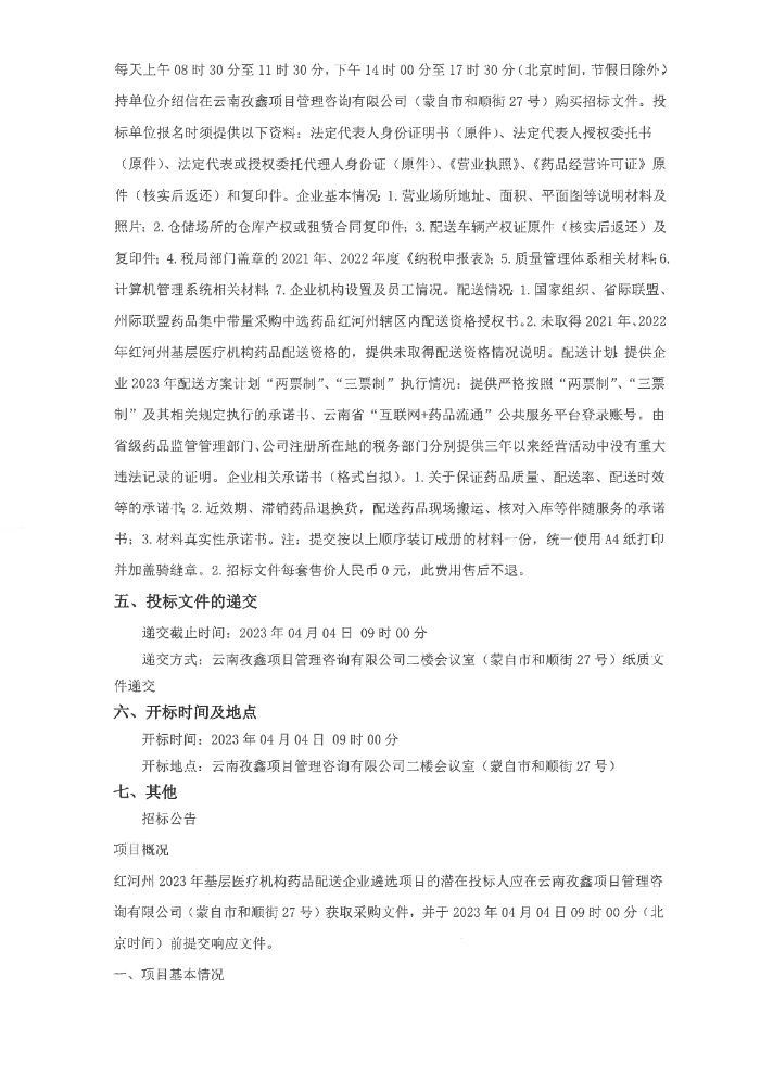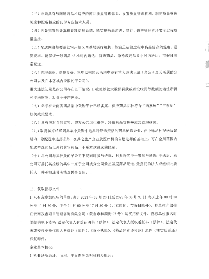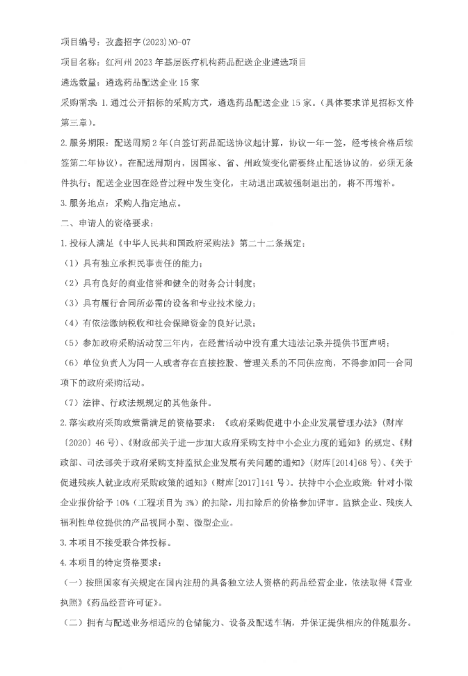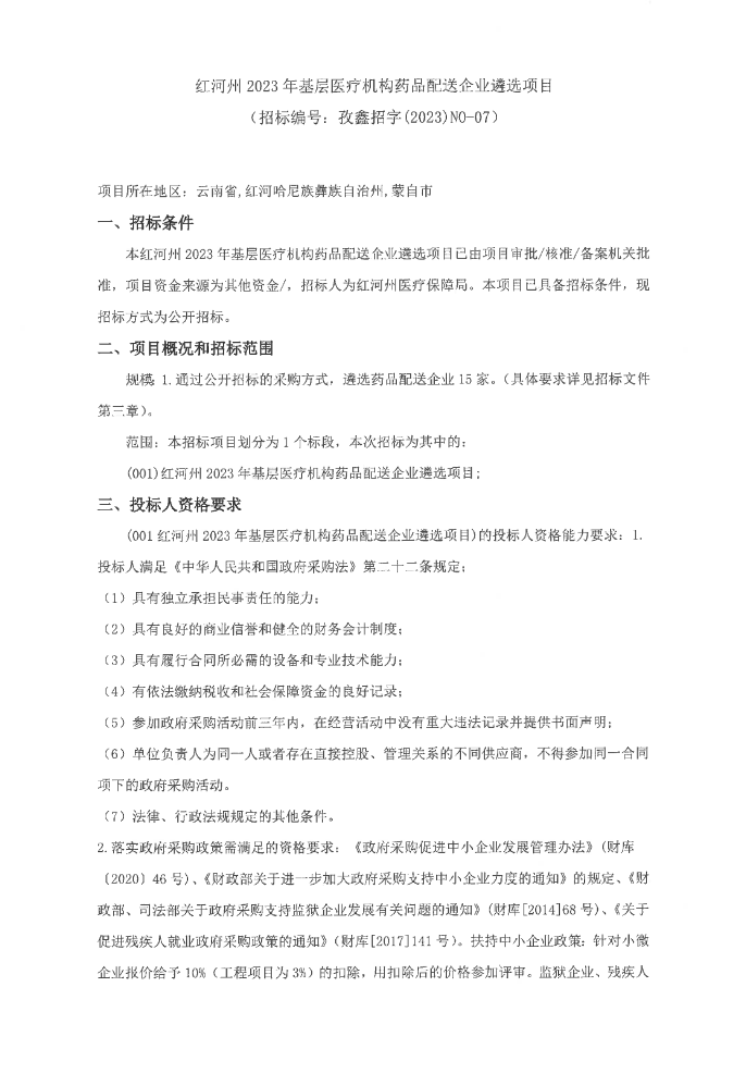 【红河州医疗保障局】云南省红河州2023年基层医疗机构药品配送企业遴选项目