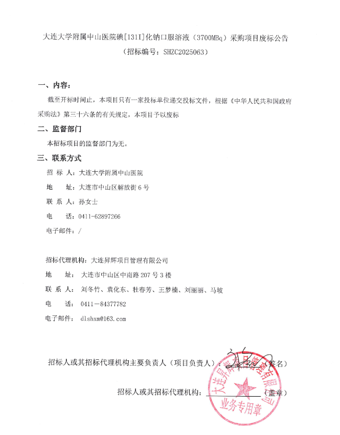 【大连大学附属中山医院】辽宁省大连大学附属中山医院碘〔131I〕化钠口服溶液(3700MBq)采购项目废标公告