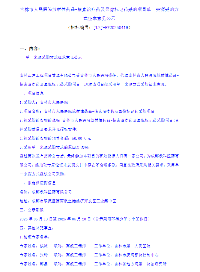 【吉林市人民医院】吉林省吉林市人民医院放射性药品-核素治疗药及显像标记药采购项目单一来源采购方式征求意见公示