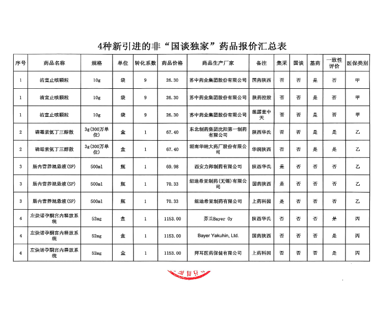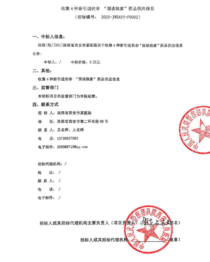 【西安市某医院】陕西省西安市某医院收集4种新引进的非 “国谈独家”药品供应信息