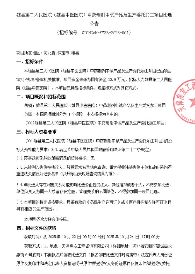 【保定市雄县第二人民医院】河北省保定市雄县第二人民医院(雄县中医医院)中药制剂中试产品及生产委托加工项目比选公告