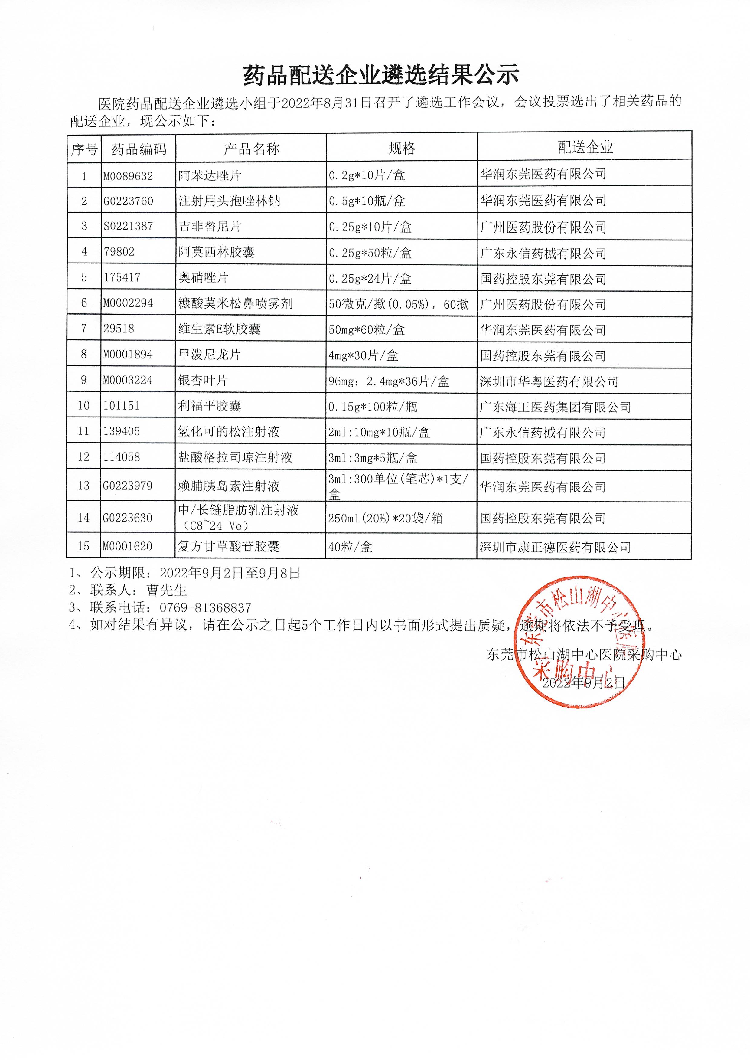 【广东省东莞市松山湖中心医院】2022-09-02药品配送遴选结果公示