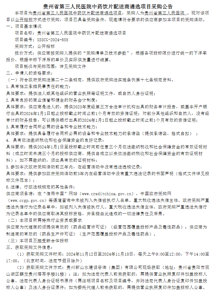 【贵州省第三人民医院】贵州省第三人民医院中药饮片配送商遴选项目采购公告