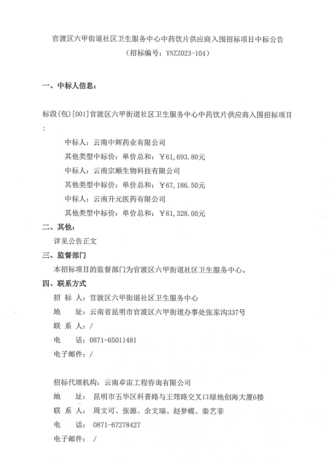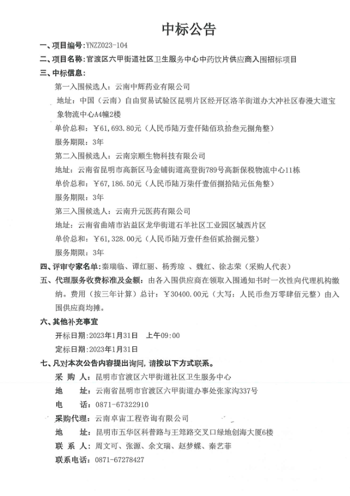【昆明市官渡区六甲街道社区卫生服务中心】云南省昆明市官渡区六甲街道社区卫生服务中心中药饮片供应商入围招标项目中标公告