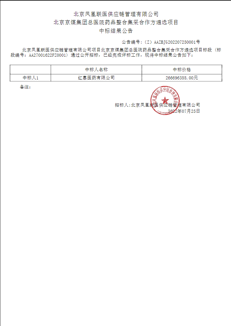 【北京京煤集团总医院】北京京煤集团总医院药品整合集采合作方遴选项目中标结果公告