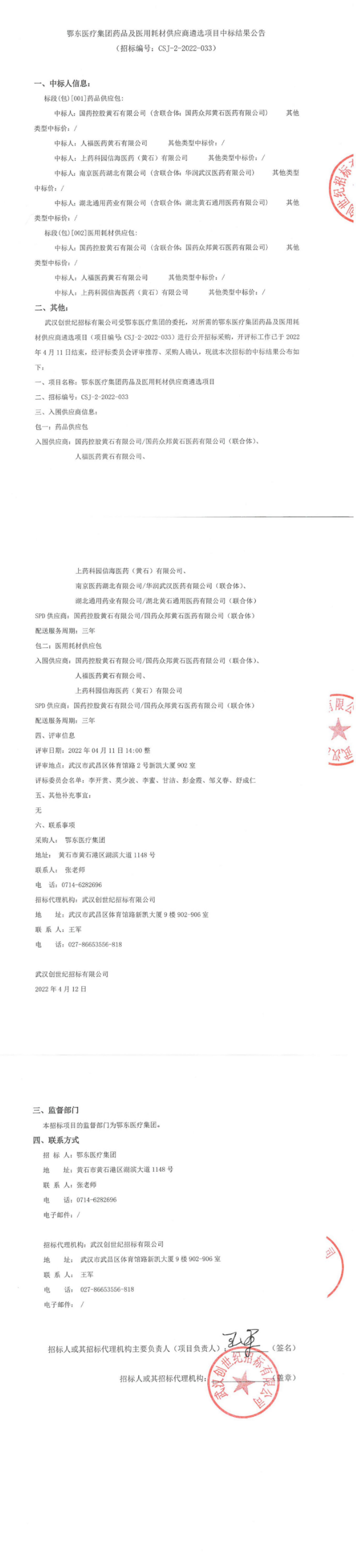 【鄂东医疗集团】鄂东医疗集团药品及医用耗材供应商遴选中标结果公告