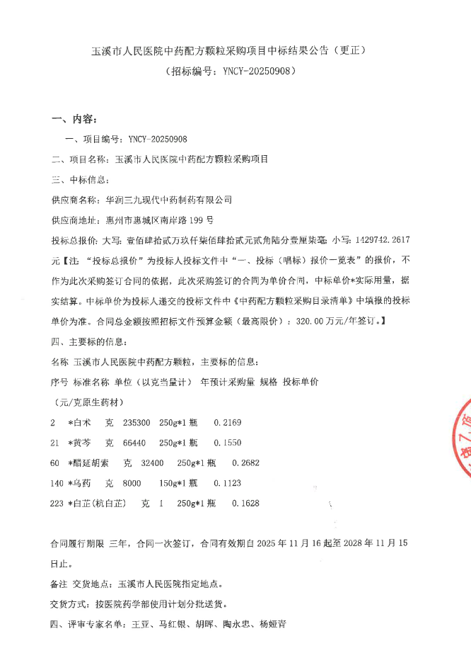 【玉溪市人民医院】云南省玉溪市人民医院中药配方颗粒采购项目中标结果公告(更正)