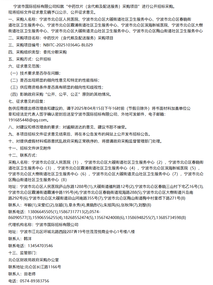 【宁波市北仑区人民医院】浙江省宁波市北仑区人民医院中药饮片(含代煎及配送服务)采购项目公开征求意见公告1