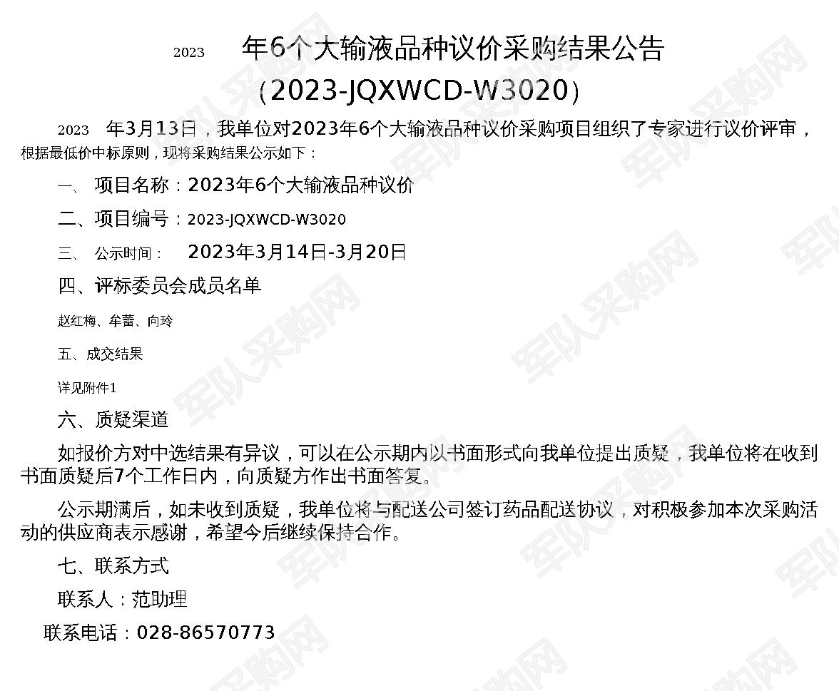 【军队采购】军队采购网2023年6个大输液品种议价采购结果公告(2023-JQXWCD-W3020)