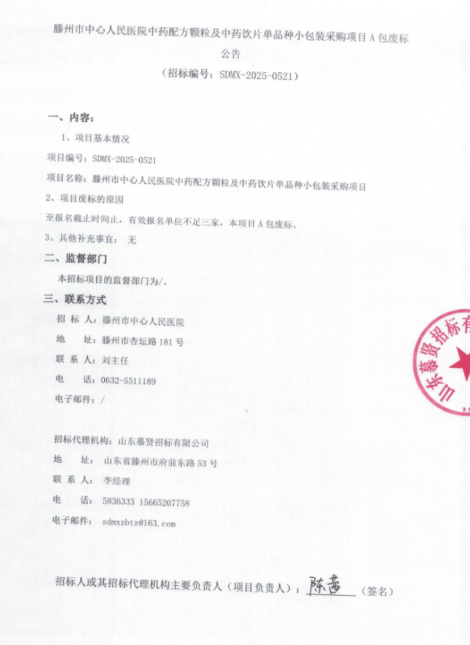 【枣庄市滕州市中心人民医院】山东省滕州市中心人民医院中药配方颗粒及中药饮片单品种小包装采购项目A包废标公告