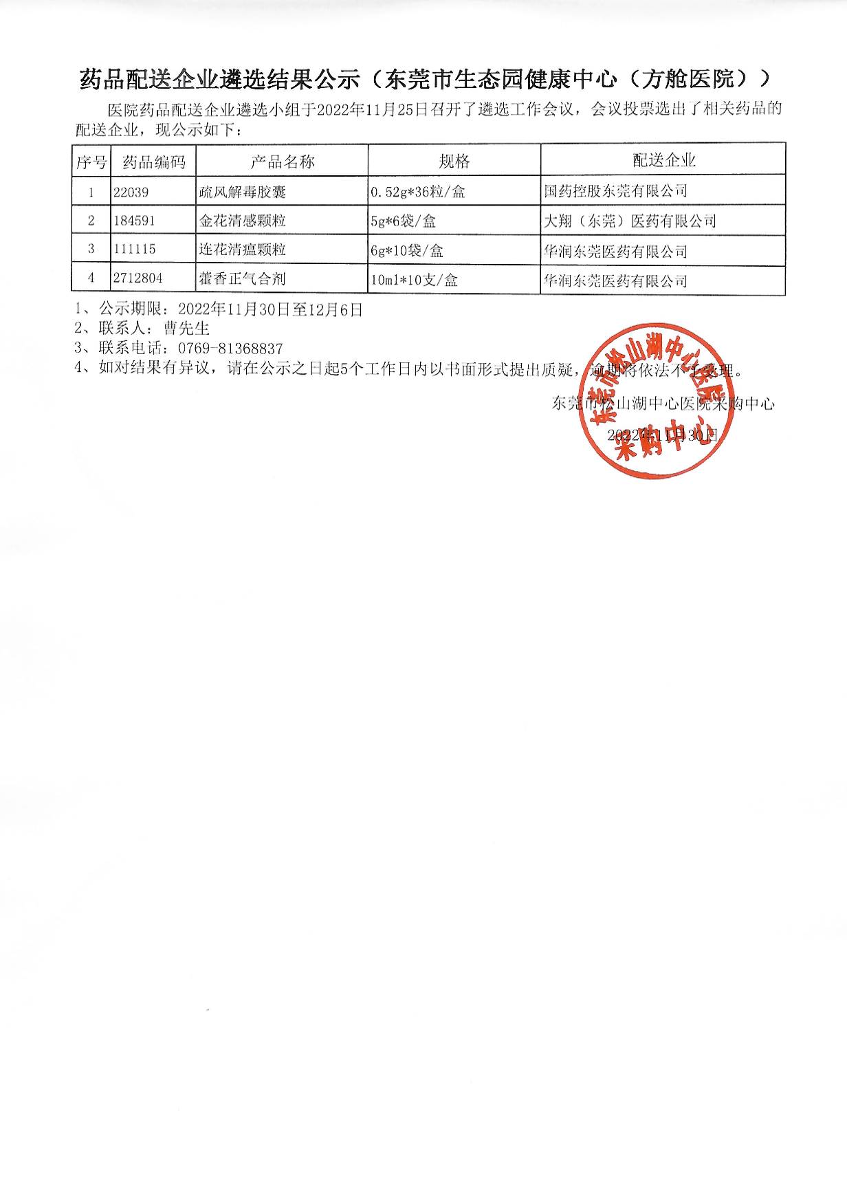 【东莞市松山湖中心医院】广东省东莞市松山湖中心医院药品配送企业遴选结果公示(2022.11.30)