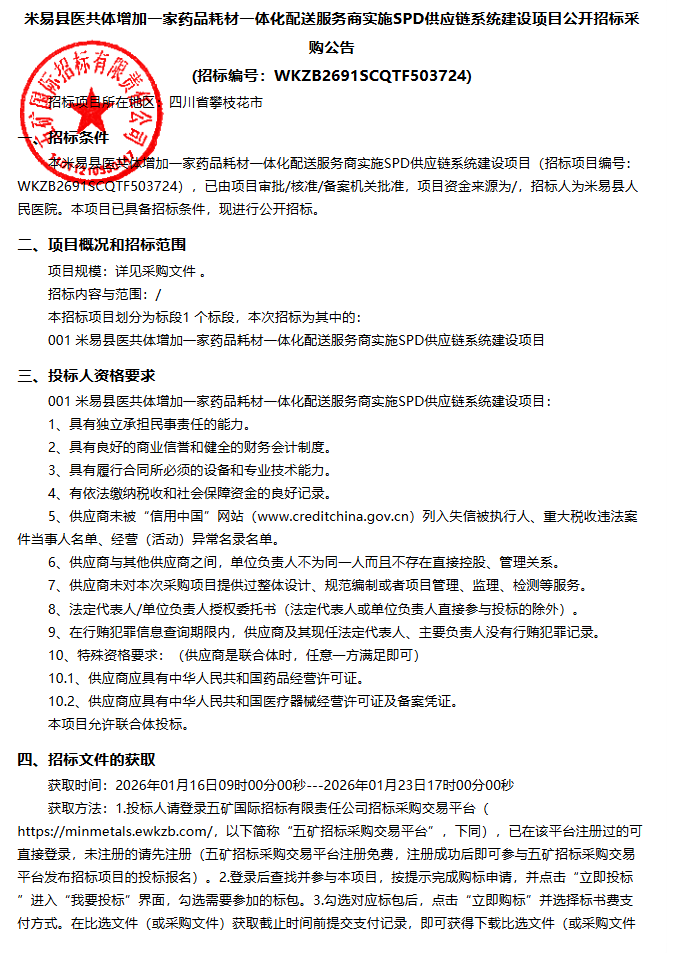 【攀枝花市米易县人民医院】四川省攀枝花市米易县医共体增加一家药品耗材一体化配送服务商实施SPD供应链系统建设项目公开招标采购公告