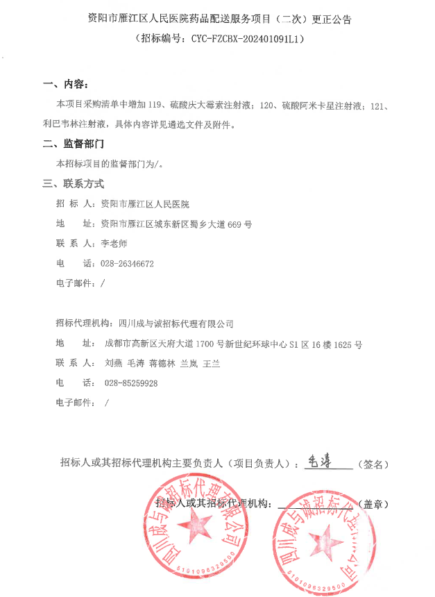 【资阳市雁江区人民医院】四川省资阳市雁江区人民医院药品配送服务项目(二次)更正公告