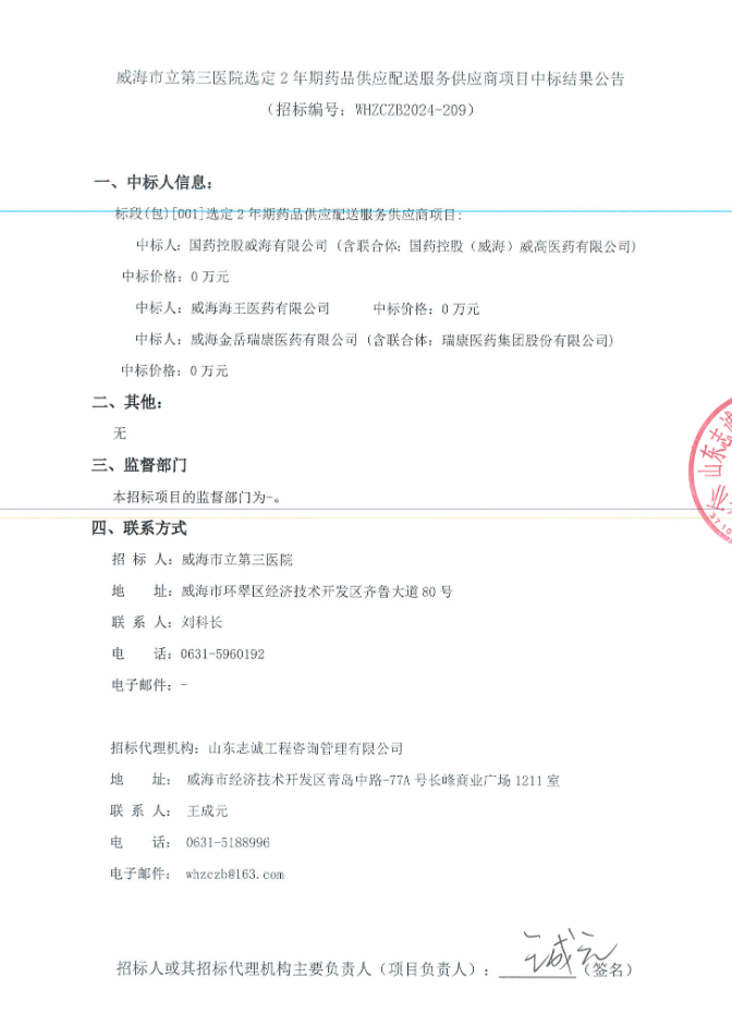 【威海市立第三医院】山东省威海市立第三医院选定2年期药品供应配送服务供应商项目中标结果公告
