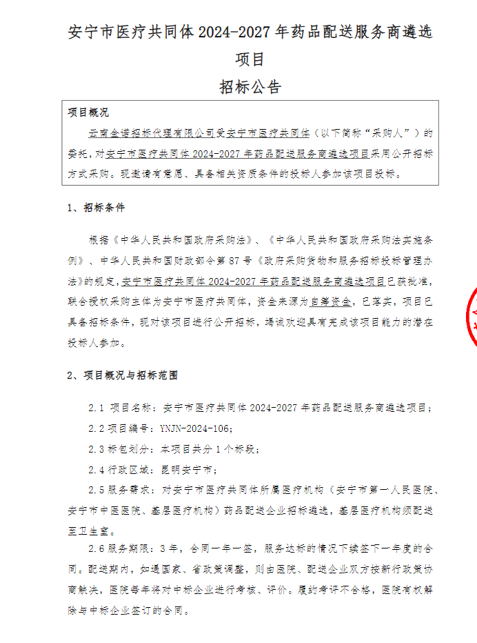 【昆明市安宁市医疗共同体】云南省昆明市安宁市医疗共同体2024-2027年药品配送服务商遴选项目招标公告