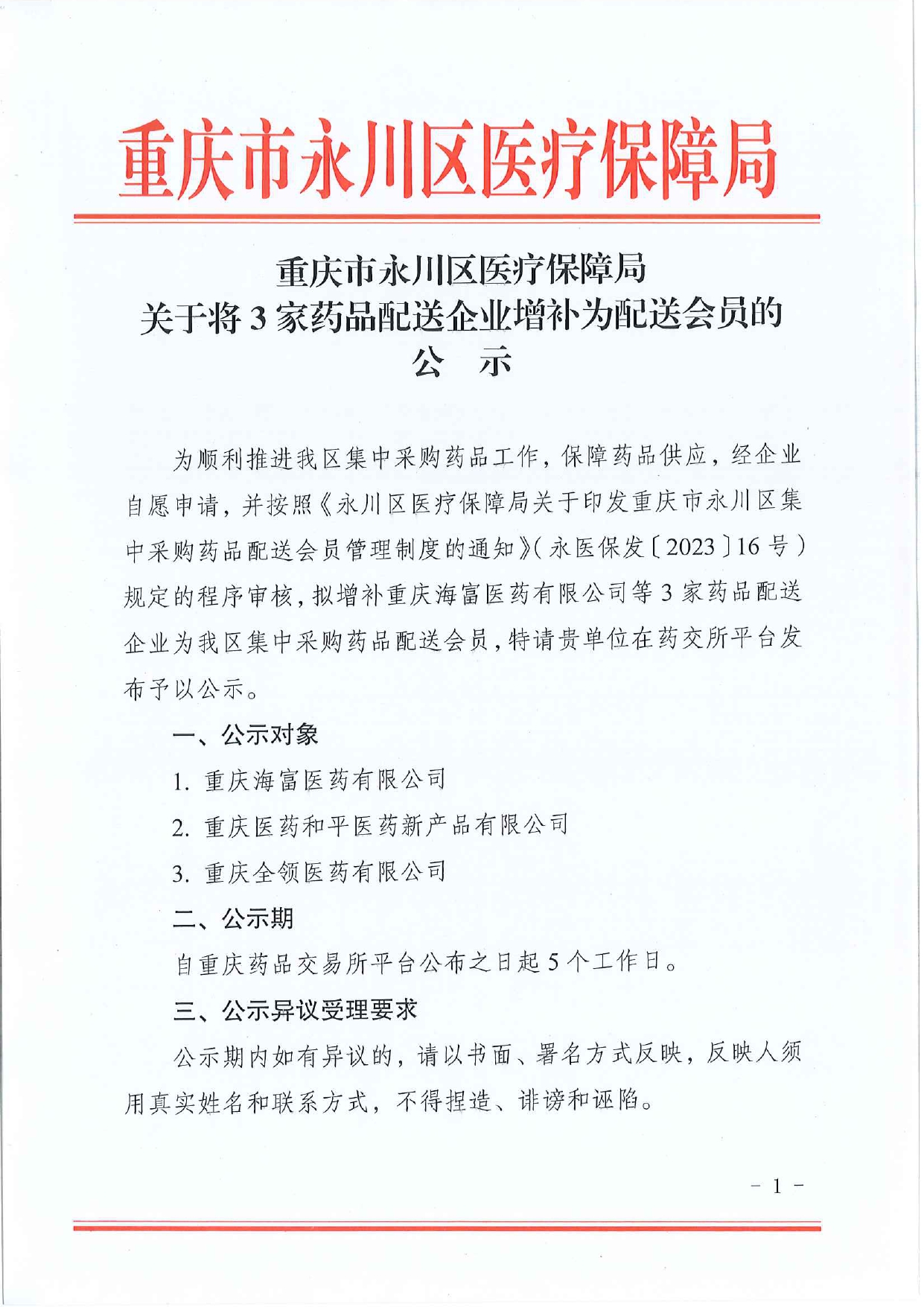 【重庆】永川区医疗保障局关于将3家药品配送企业增补为配送会员的公示