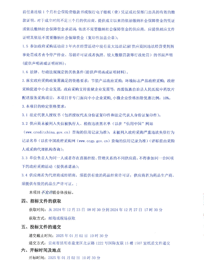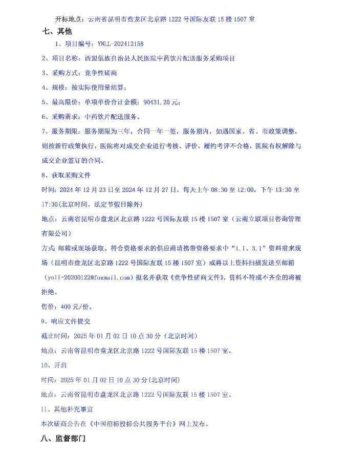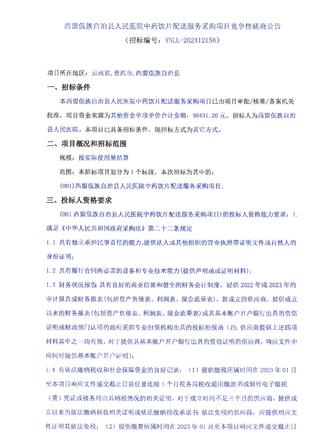 【普洱市西盟佤族自治县人民医院】云南省普洱市西盟佤族自治县人民医院中药饮片配送服务采购项目竞争性磋商公告