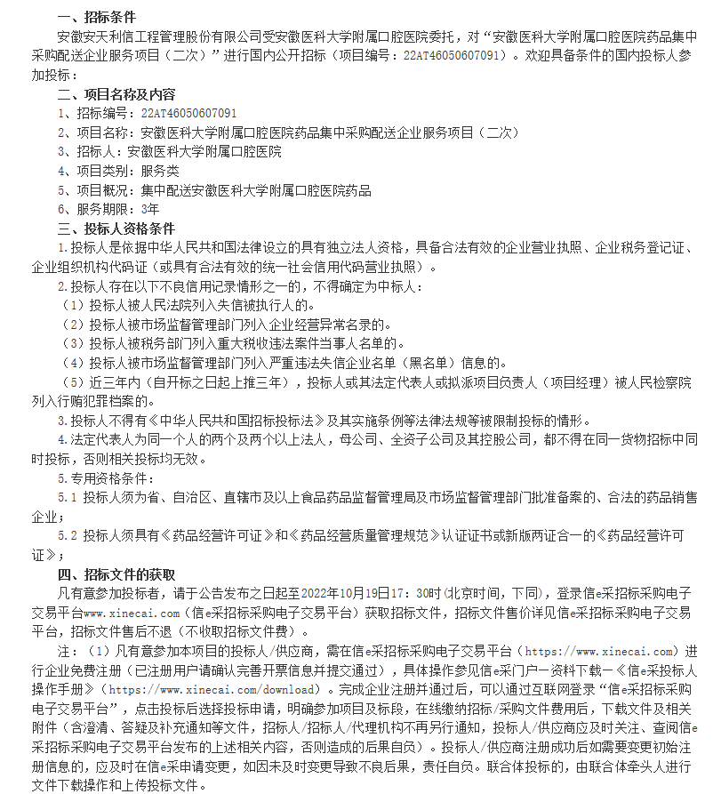 【安徽医科大学附属口腔医院】药品集中采购配送企业服务项目(二次)招标公告