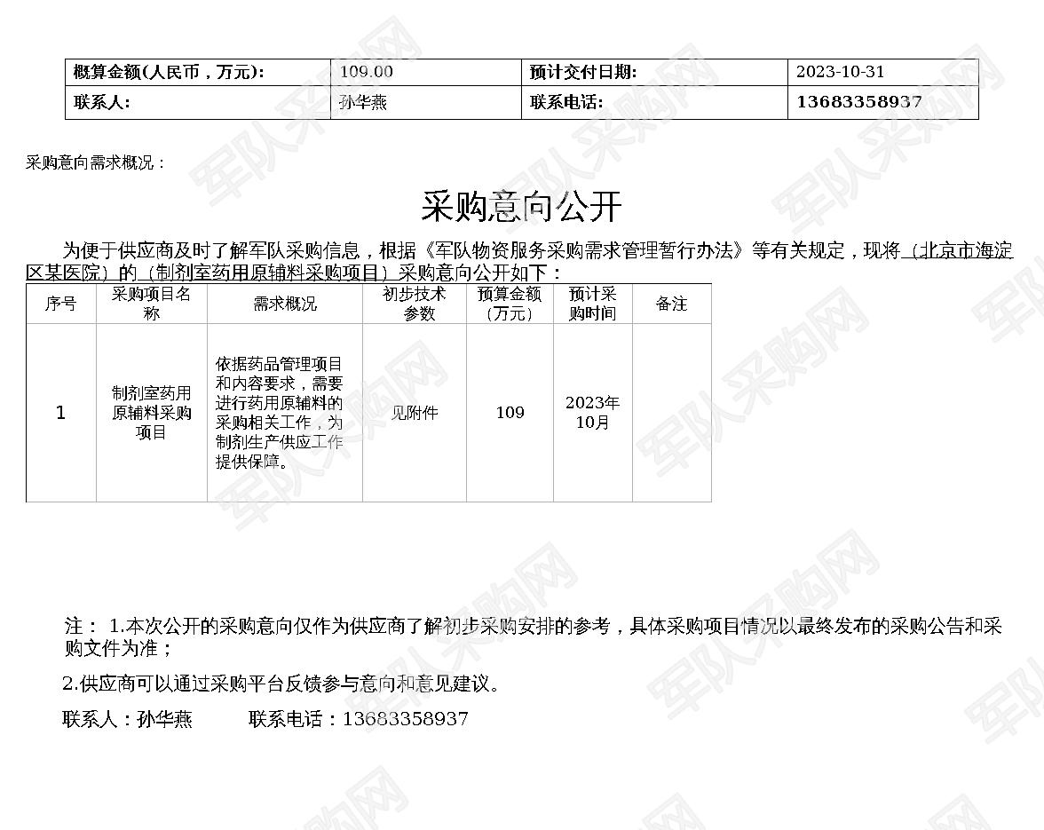 【军队采购】军队采购网制剂室药用原辅料采购项目采购意向公开