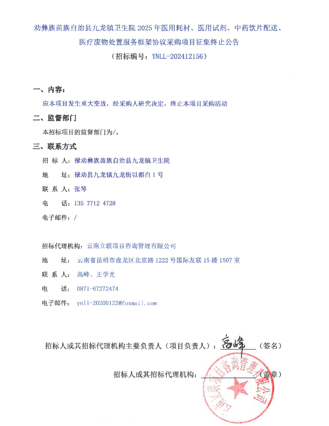 【昆明市禄劝彝族苗族自治县九龙镇卫生院】云南省昆明市禄劝彝族苗族自治县九龙镇卫生院2025年医用耗材、医用试剂、中药饮片配送、医疗废物处置服务框架协议采购项目征集终止公告