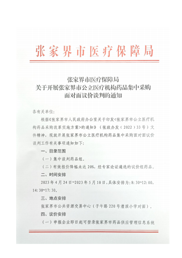 根据《张家界市人民政府办公室关于印发<张家界市公立医疗机构药品采购改革实施方案>的通知》(张政办发(2022)33号)文件精神,现就开展张家界市公立医疗机构药品集中采购面对面议价谈判工作有关事项通知如下:
