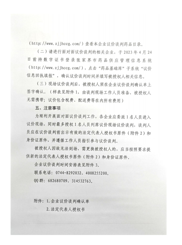 (二)请进行面对面议价谈判的相关企业,于2023年4月24 日前持数字证书登录张家界市药品供应管理信息系统(http://www.zjjhccg.com/),点击“药品基础库”子系统“议价信息回执填报",确认议价谈判时间并填写被授权人相关信息。