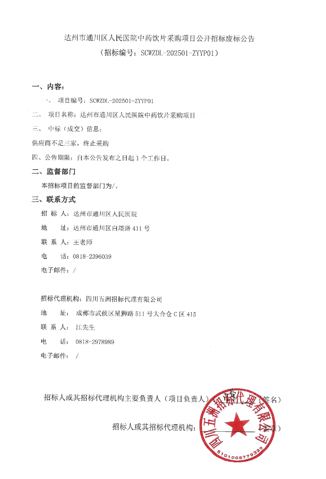 【达州市通川区人民医院】四川省达州市通川区人民医院中药饮片采购项目公开招标废标公告