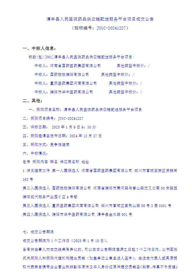 【濮阳市清丰县人民医院】河南省濮阳市清丰县人民医院药品供应链配送服务平台项目成交公告