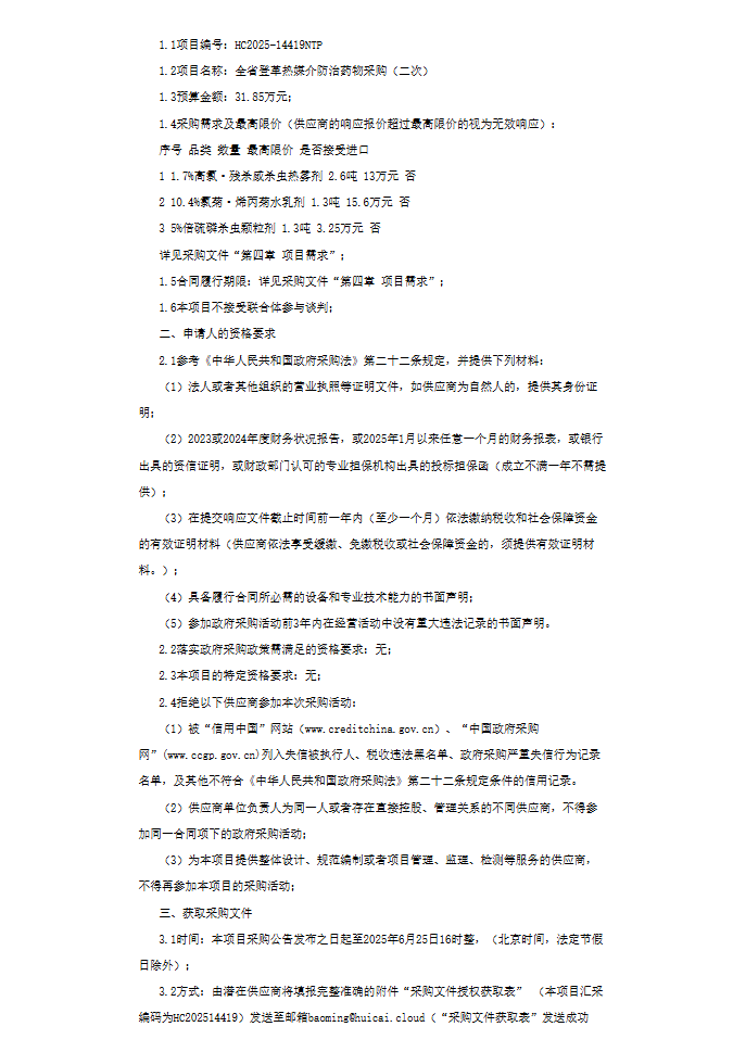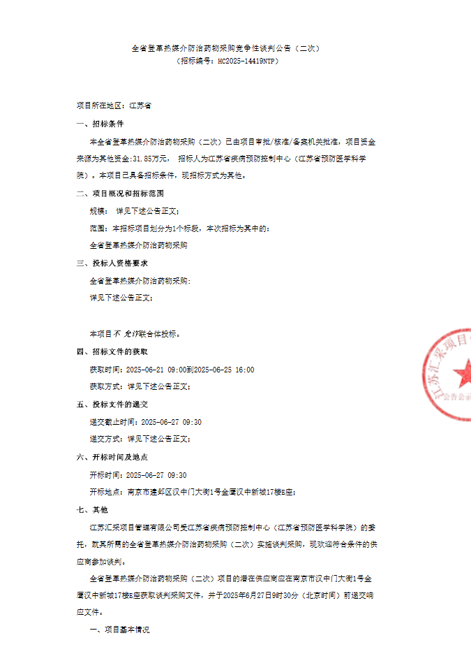 【江苏省疾病预防控制中心】江苏省疾病预防控制中心(江苏省预防医学科学院)全省登革热媒介防治药物采购竞争性谈判公告(二次)