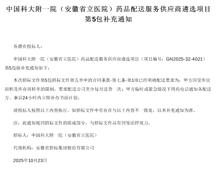 【安徽省立医院】中国科大附一院(安徽省立医院)药品配送服务供应商遴选项目第5包补充通知