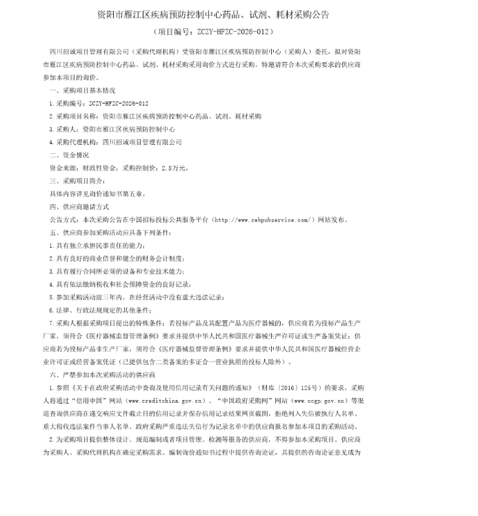 【资阳市雁江区疾病预防控制中心】四川省资阳市雁江区疾病预防控制中心药品、试剂、耗材采购公告