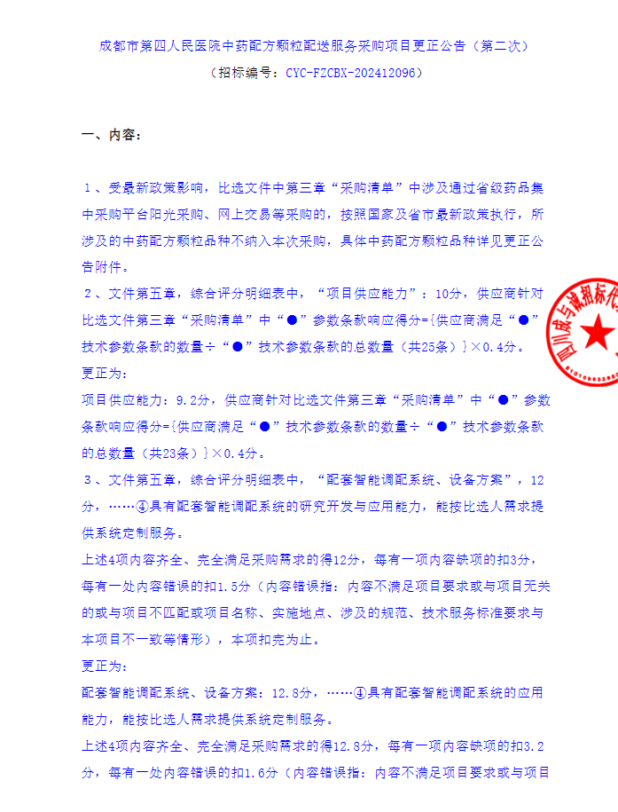 【成都市第四人民医院】四川省成都市第四人民医院中药配方颗粒配送服务采购项目更正公告(第二次)