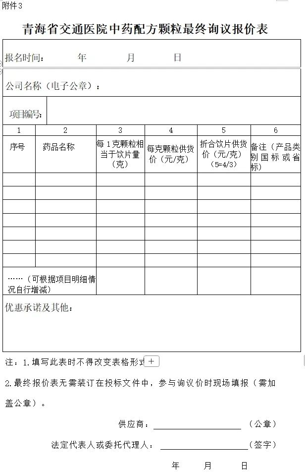 报价表中统一以中药配方颗粒国家标准或最新省级标准折合每克传统饮片进行报价。供应商须提供中药配方颗粒的调配设备及技术支持,医院仅获有使用权,所有权归供应商。