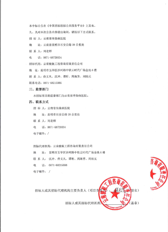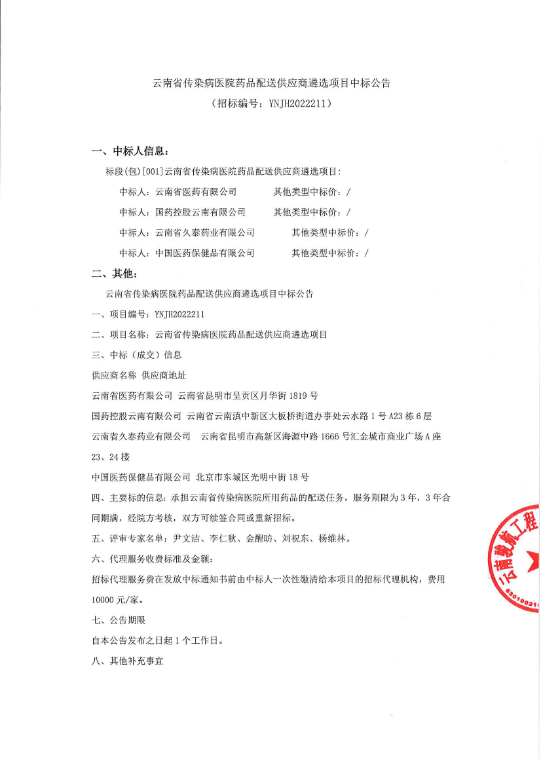 【云南省传染病医院】云南省传染病医院药品配送供应商遴选项目中标公告
