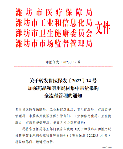 现将省医保局等五部门联合印发的《关于加强药品和医用耗材集中带量采购全流程管理的通知》(鲁医保发〔2023〕14 号)转发给你们,请遵照执行。