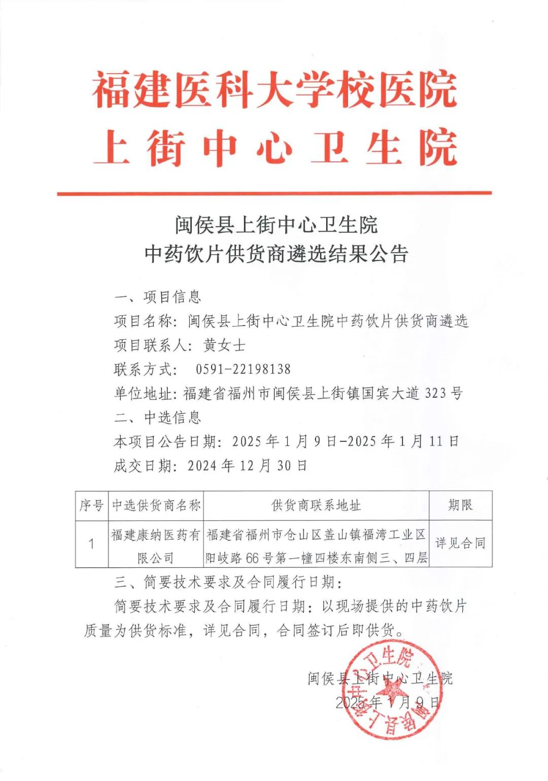 【福州市闽侯县上街中心卫生院】福建省福州市闽侯县上街中心卫生院中药饮片供货商遴选结果公告