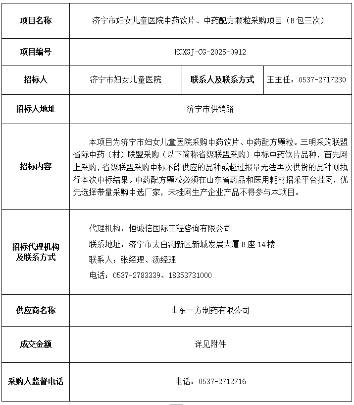 恒诚信国际工程咨询有限公司受济宁市妇女儿童医院的委托,于2025年10月28日09时30分就济宁市妇女儿童医院中药饮片、中药配方颗粒采购项目(B包三次)采用单一来源方式进行招标。现将成交结果公示如下: