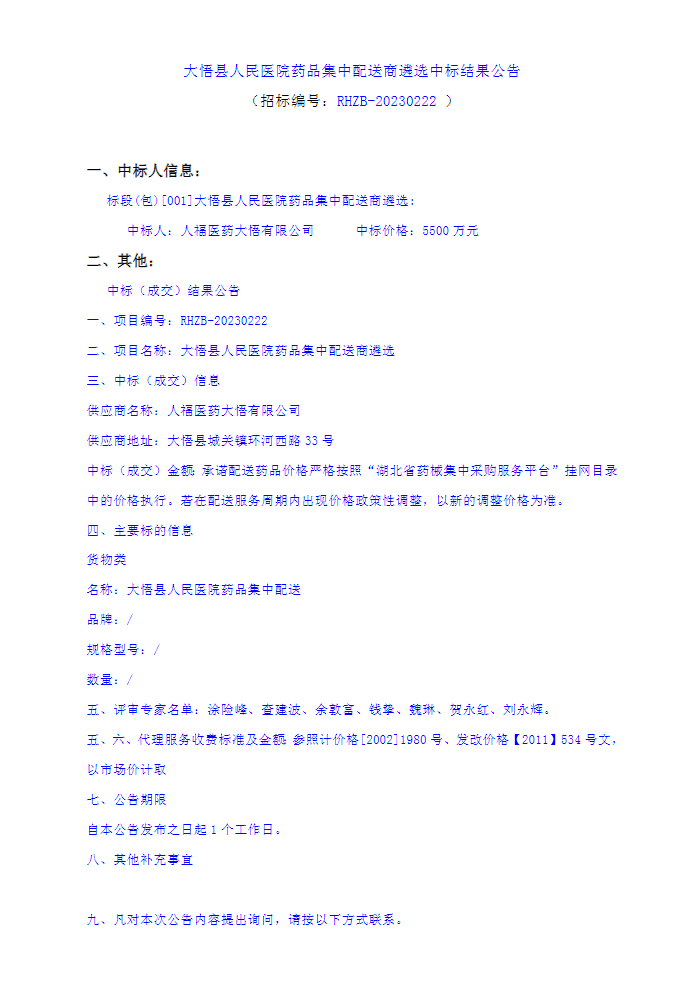 【孝感市大悟县人民医院】湖北省孝感市大悟县人民医院药品集中配送商遴选中标结果公告