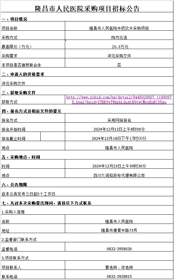 四川久润招投标代理有限公司受隆昌市人民医院委托,就批准实施隆昌市人民医院中药饮片采购项目(二次)进行竞争性磋商,现邀请符合本次采购要求的供应商参加磋商。