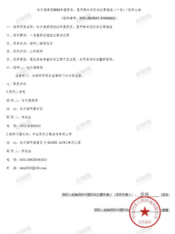【哈尔滨某院】哈尔滨某院2022年度药品,医用耗材试剂供应商遴选招标变更公告