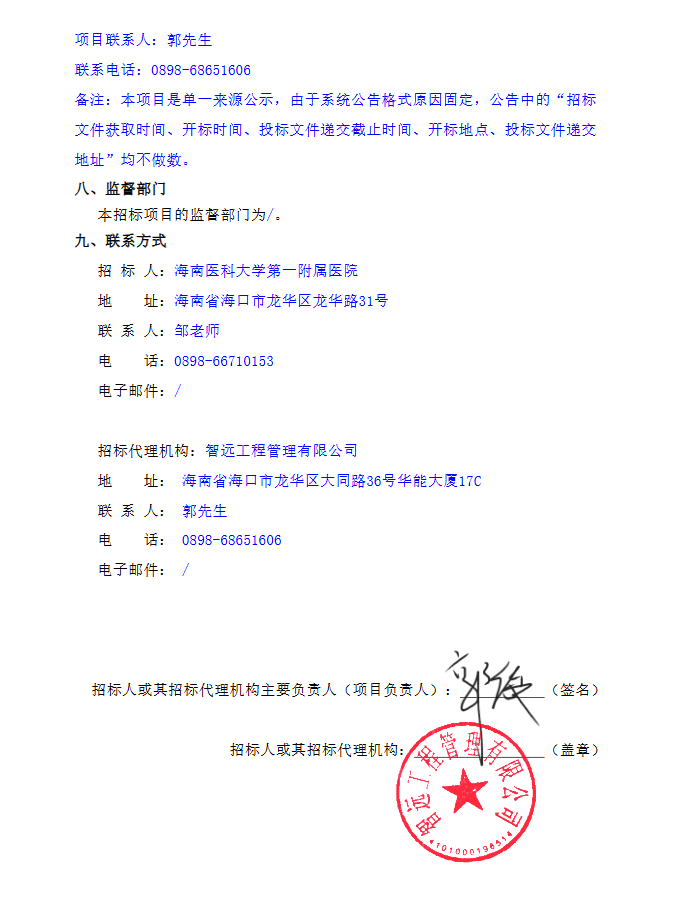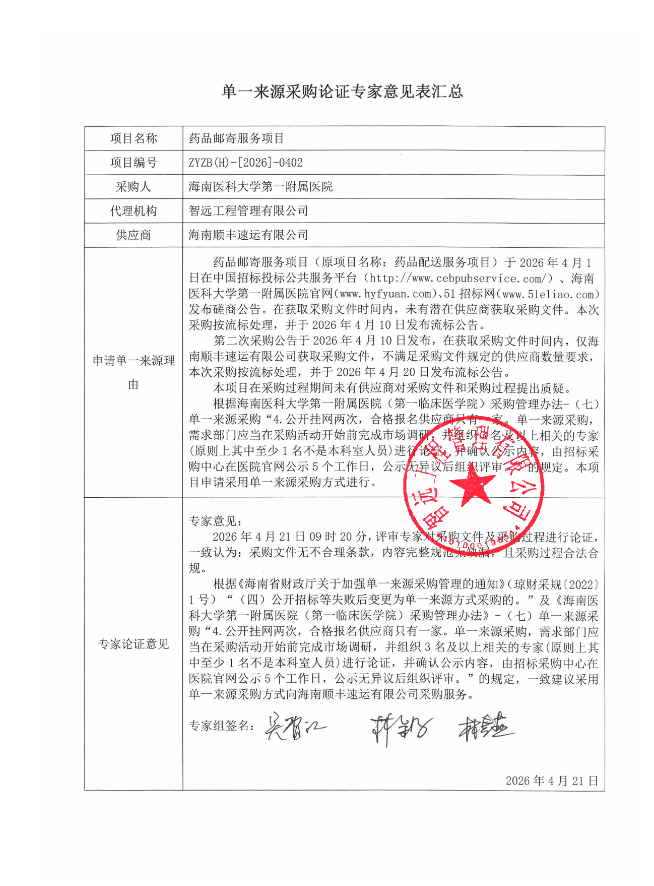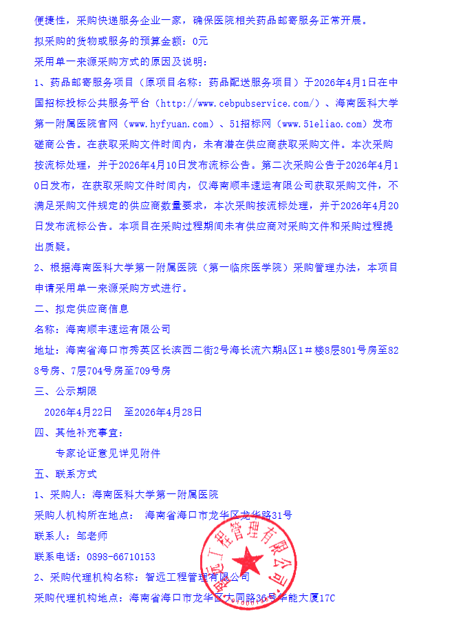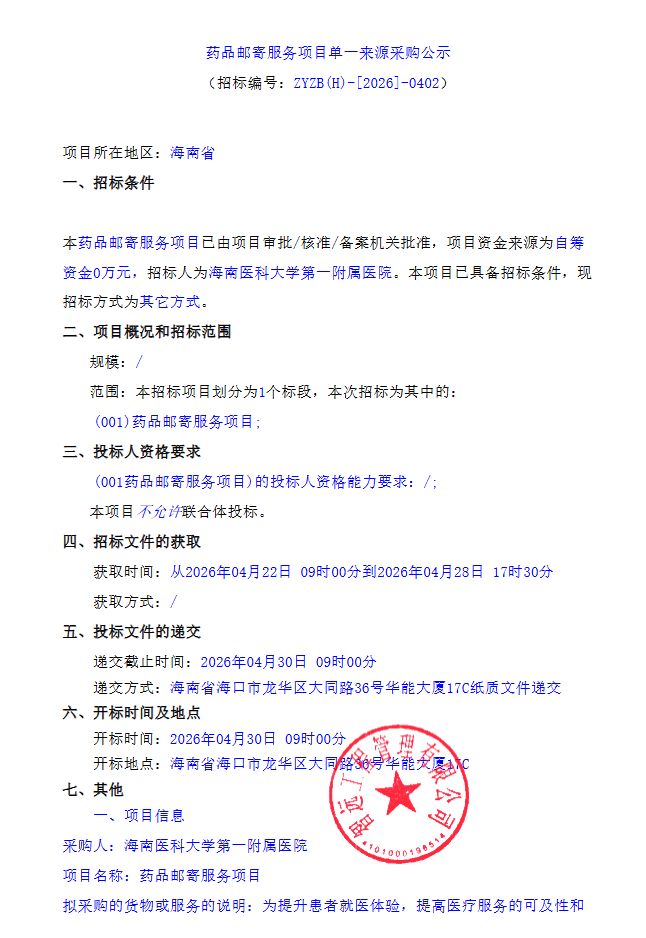 【海南医科大学第一附属医院】海南医科大学第一附属医院药品邮寄服务项目单一来源采购公示