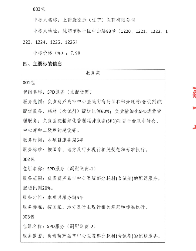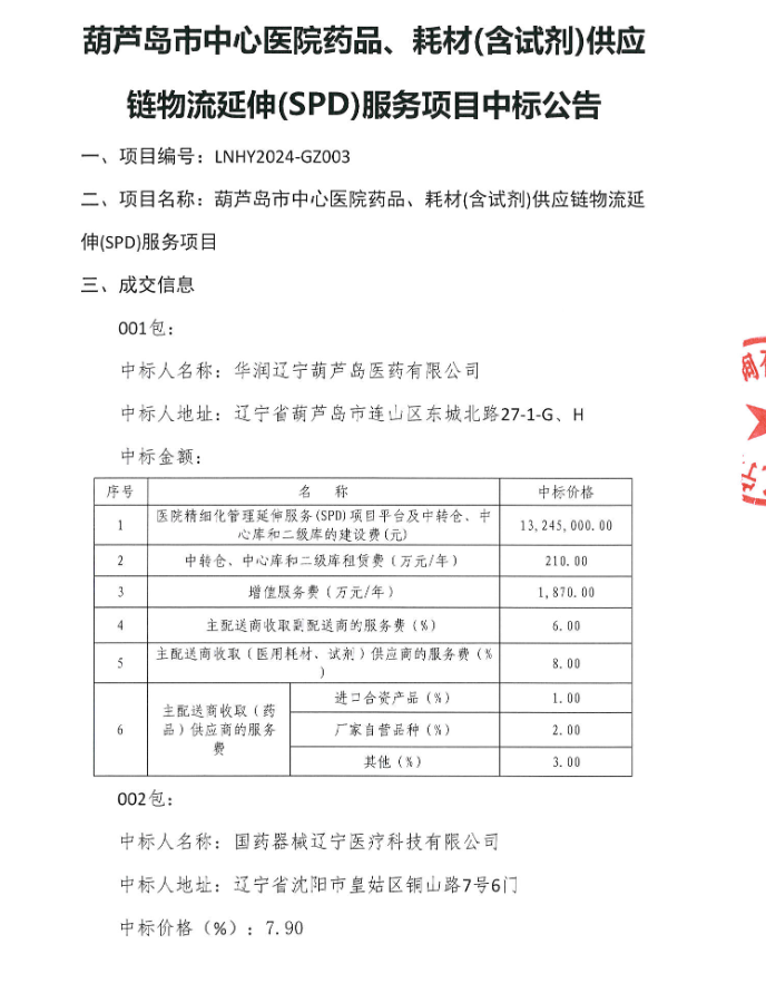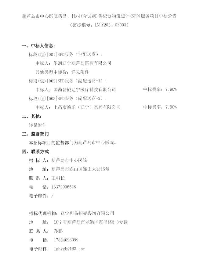 【葫芦岛市中心医院】辽宁省葫芦岛市中心医院药品、耗材(含试剂)供应链物流延伸(SPD)服务项目中标公告
