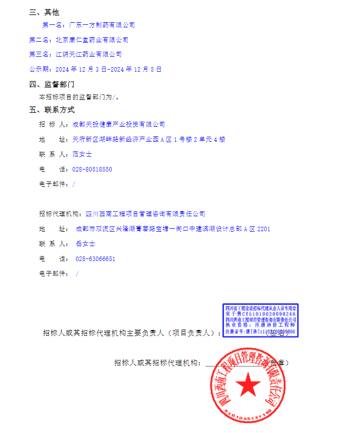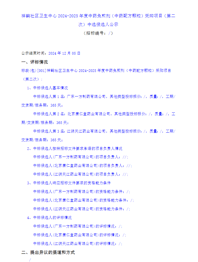 【成都市祥鹤社区卫生中心】四川省成都市祥鹤社区卫生中心2024-2025年度中药免煎剂(中药配方颗粒)采购项目(第二次)中选候选人公示