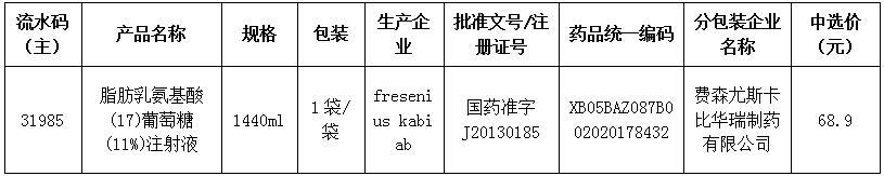 近日,接到费森尤斯卡比华瑞制药有限公司申请,经会议研究,现将该企业脂肪乳氨基酸(17)葡萄糖(11%)注射液进口分包装药品纳入第五批国家组织药品集中采购安徽中选药品网上采购目录,详见下表:新增后中选企业原履行的义务和责任不变。请各医疗机构及时调整采购目录及计划。