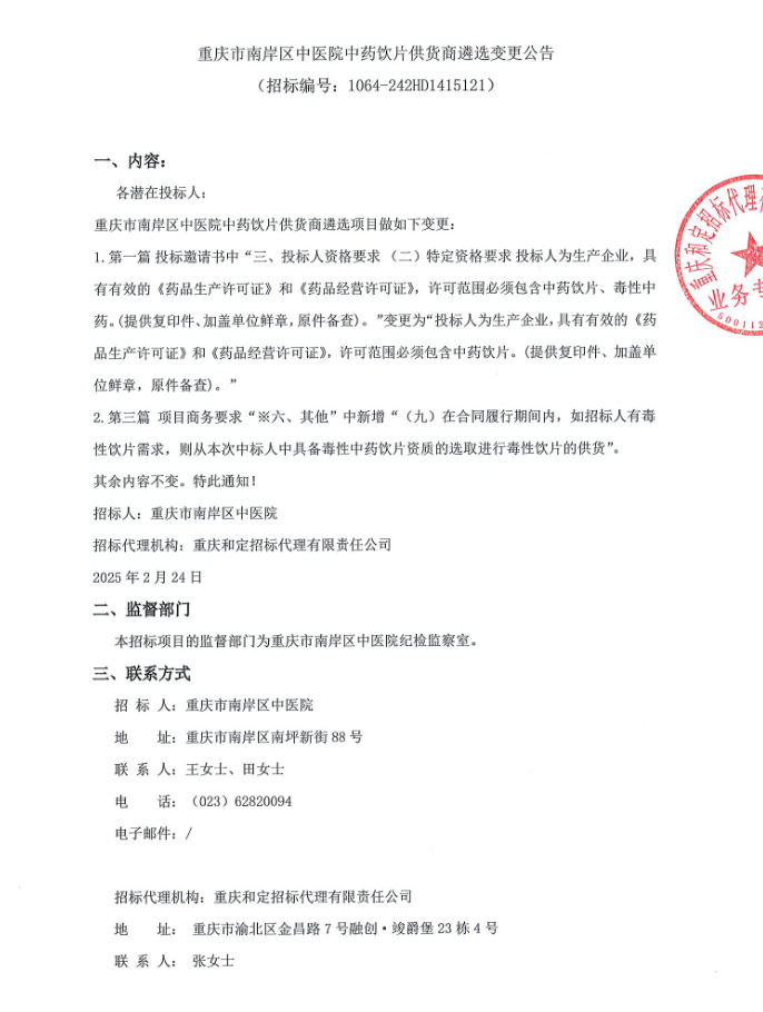 【重庆市南岸区中医院】重庆市南岸区中医院中药饮片供货商遴选变更公告(20250224)
